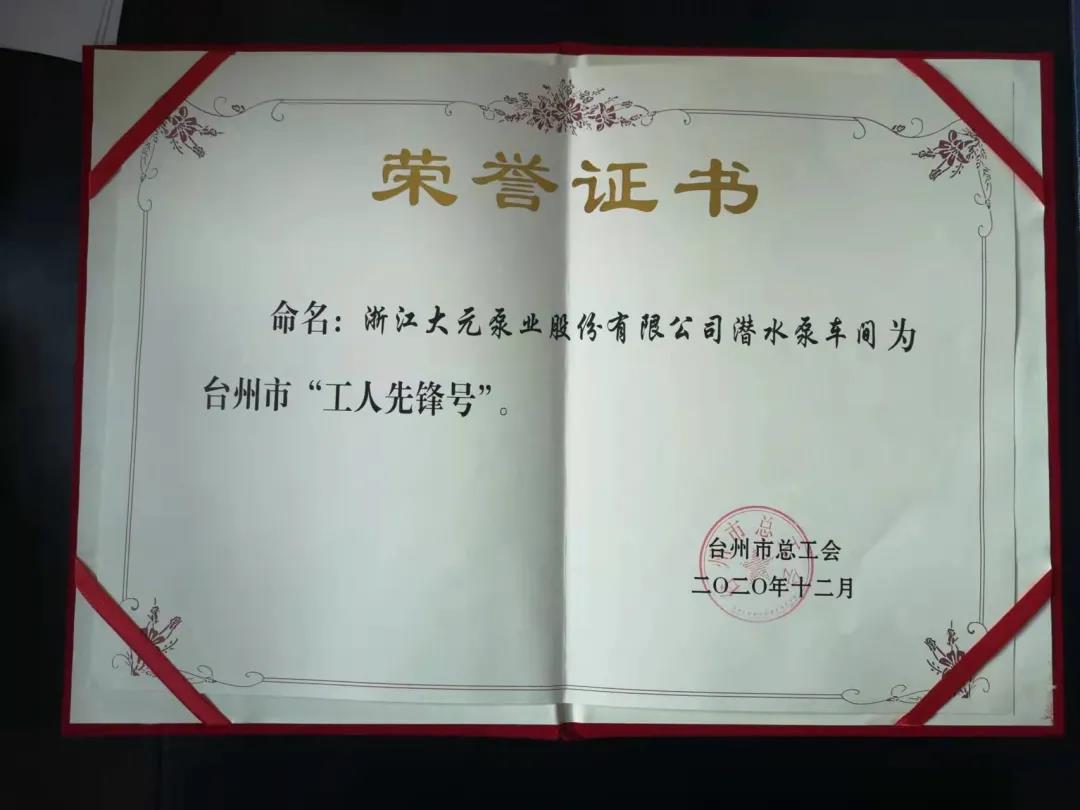 “创一流工作、一流服务、一流业绩、一流团队”,2021年大元泵业潜水泵车间被命为“台州市工人先锋号”。这不仅仅是潜水泵车间的实至名归,更离不开全体大元泵业团队的共同努力。