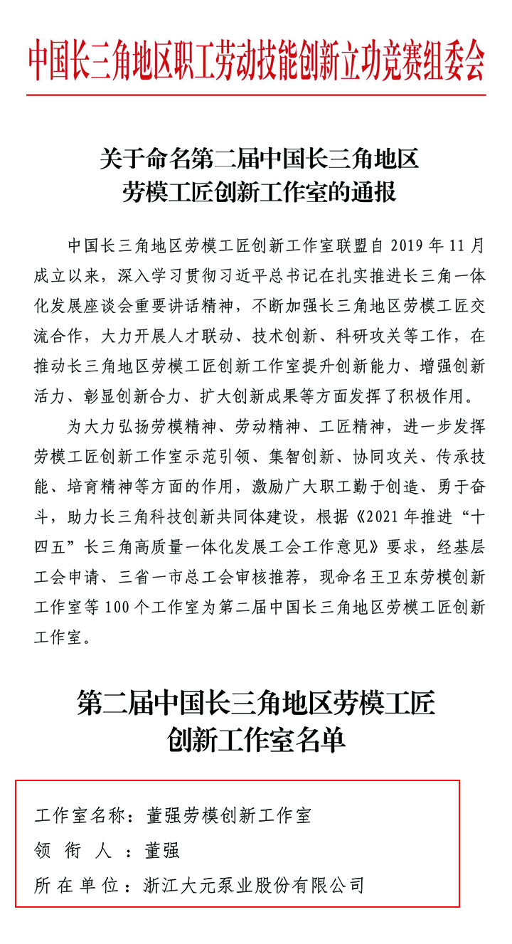 近日,第二届中国长三角地区劳模工匠创新工作室名单公布,pg电子官方网站模拟器泵业股份有限公司董强劳模创新工作室脱颖而出,荣获“中国长三角地区劳模工匠创新工作室”称号。